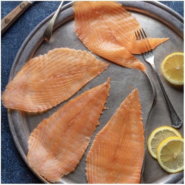 Saumon fumé à la sciure de hêtre vert et salé au sel de Guérande.