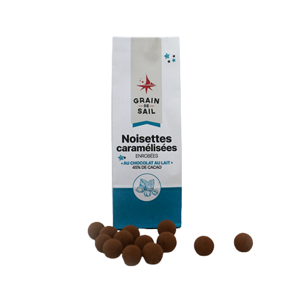 Noisettes caramélisées enrobées au chocolat au lait, 45% de cacao. Ingrédients : noisettes caramélisées au sucre et au miel* (33%)(noisettes*,sucre*, miel*), sucre de canne*, beurre de cacao*, cacao*, poudre de lait entier*(10,7%), poudre de lait écrémé* (4,5%), poudre de cacao dégraissée* (10-12% de matières grasses), émulsifiant : lécithine de tournesol*, fleur de sel, poudre de vanille*. *Ingrédient issu de l’agriculture biologique. Cacao : 45% minimum dans le chocolat au lait