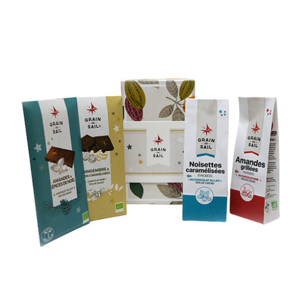 Tablette de chocolat au Lait 45% de cacao avec inclusions éclats d'amandes grillées et épices de Noël. Ingrédients : sucre de canne*, beurre de cacao*, cacao*, poudre de lait entier* (14,6%), éclats d'amandes grillées*(10%), poudre de lait écrémé* (6,2%), mélange quatre épices*(1,5%) (cannelle poudre*, gingembre poudre*, muscade poudre*, girofle poudre*), émulsifiant : lécithine de tournesol*, fleur de sel, poudre de vanille*. *Ingrédient issu de l'agriculture biologique. Cacao 45% minimum dans le chocolat au lait.